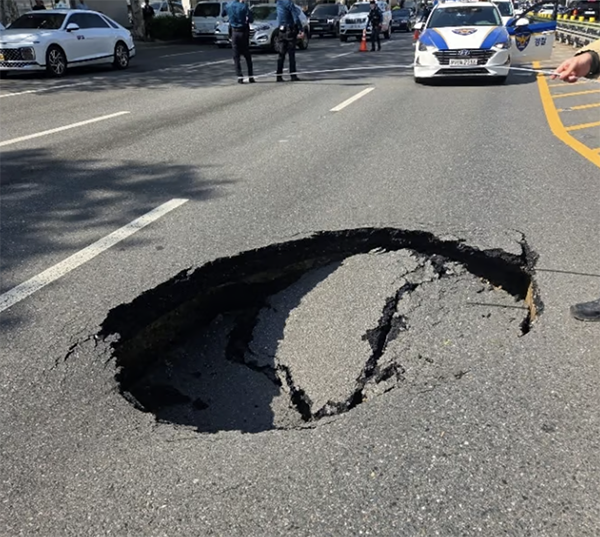 오늘 오후 3시 35분경, 강동구 길동사거리 인근 도로에서 지름 1.5m, 깊이 1.5m 크기의 싱크홀이 발견됐습니다. 구청에 따르면 사고 원인은 상수도 배수 밸브 누수로 인한 지반 침하로 확인되었습니다. 다행히 인명피해는 없었지만, 현재 3개 차선을 통제하며 긴급 보수 작업이 진행 중입니다.