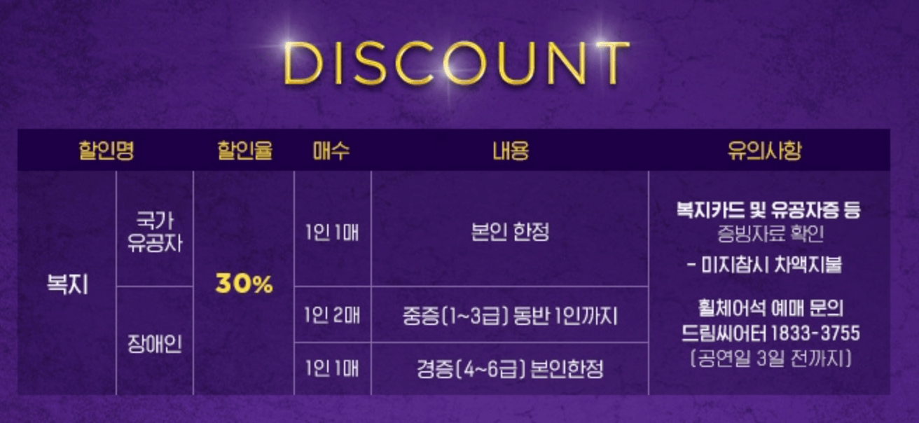 휠체어석 예매문의 : 드림씨어터 1833-3755 (공연일 3일 전까지)