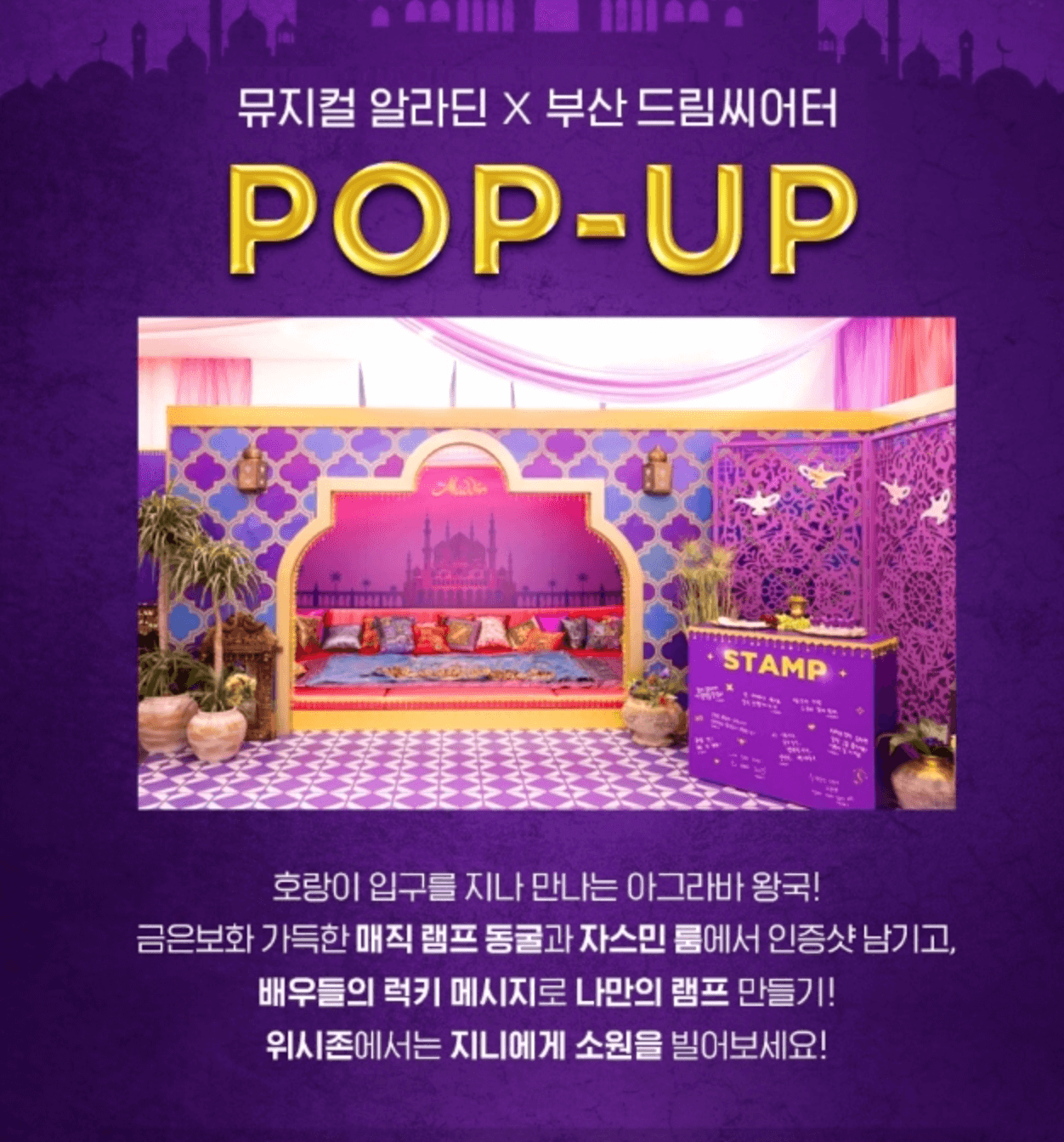 개막 전, 드림씨어터에서 먼저 만날 수 있는 〈알라딘〉 팝업존도 있다고 하니 놓치지 마세요!