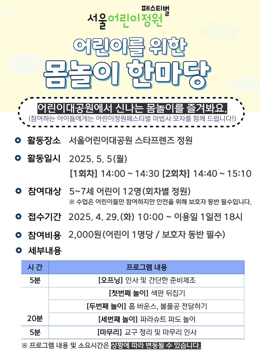 - 일시: 2025년 5월 5일(월) ~ 5월 18일(일) 어린이날 개막식