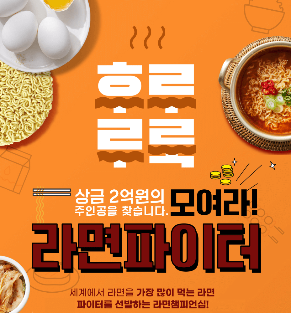 - 라면요리 왕 콘테스트: 1등 상금 1억 원, 2등 5000만 원, 입선 500만 원(홈페이지 사전 참가신청)